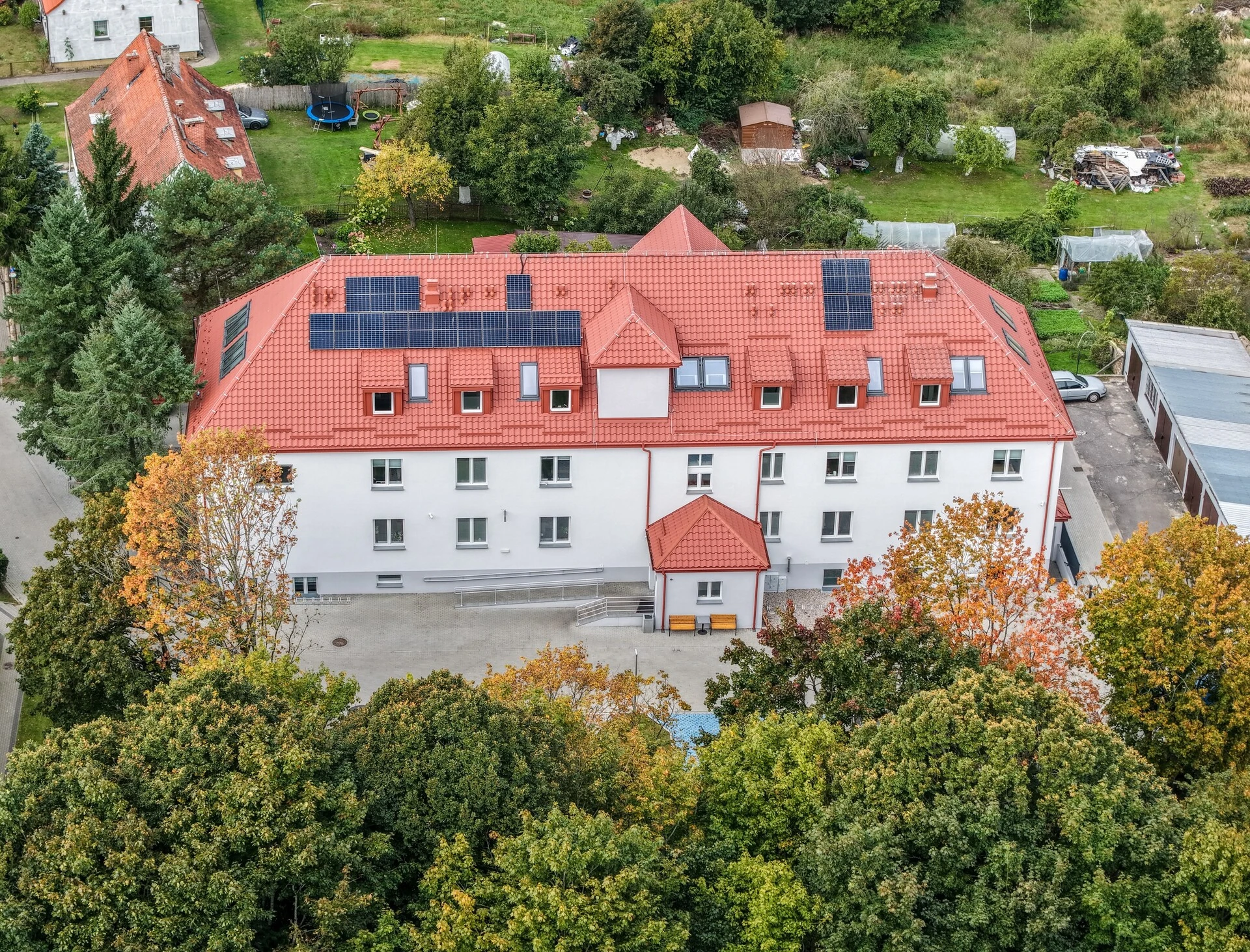 W budynku znajduje się siłownia, sauna, stołówka i 85 miejsc noclegowych w pokojach, z których każdy ma osobną toaletę.